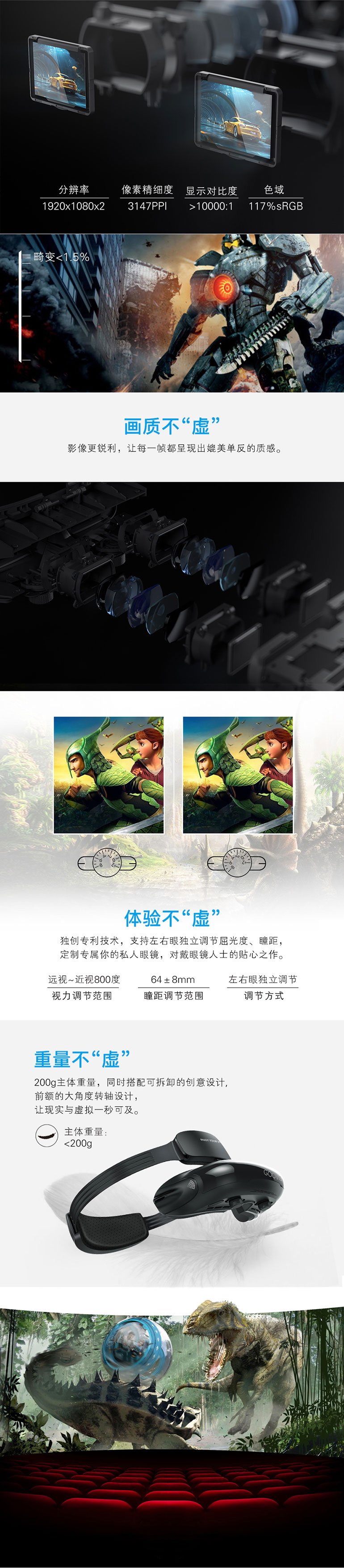 但(dàn)是(shì)需要(yào)強調的(de)是(shì),G1 是(shì)一(yī)款頭戴影(yǐng)院,在分(fēn)辨率受到(dào)顯示屏技(jì)術(shù)限<制(zhì)時(shí),VR 設備選擇将畫(huà)面糊到(dào)臉上(shàng),犧牲清晰度換取更大(dà)的(de)視(shì)場(chǎng)角和(h★é)更好(hǎo)的(de)沉浸感;而側重視(shì)頻(pín)觀看(kàn)效果的(de)頭戴影(yǐng)院設備則選擇将畫(huà)面放(fàng)在「遠(yuǎn")處」,帶來(lái)更清晰的(de)畫(huà)面和(hé)更小(xiǎo)的(de)畸變——畢竟現(xiàn)實中也(yě)沒人(rén)想坐(zuò)第一(yī)排趴 到(dào)銀(yín)幕上(shàng)看(kàn)電(diàn)影(yǐng)……